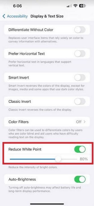 کافی است به تنظیمات بروید و در بخش Accessibility و سپس Display & Text Size، گزینهی Reduce White Point را فعال کنید. فعال کردن این گزینه، شدت روشنایی در صفحه را کم میکند. حالا هرچه شما این اسلایدر را به سمت ۱۰۰ ببرید، در ظرفیت باتری بیشتر صرفهجویی خواهد شد و هرچه آن را کمتر نگه دارید، توان بیشتری از پنل گوشی گرفته میشود.