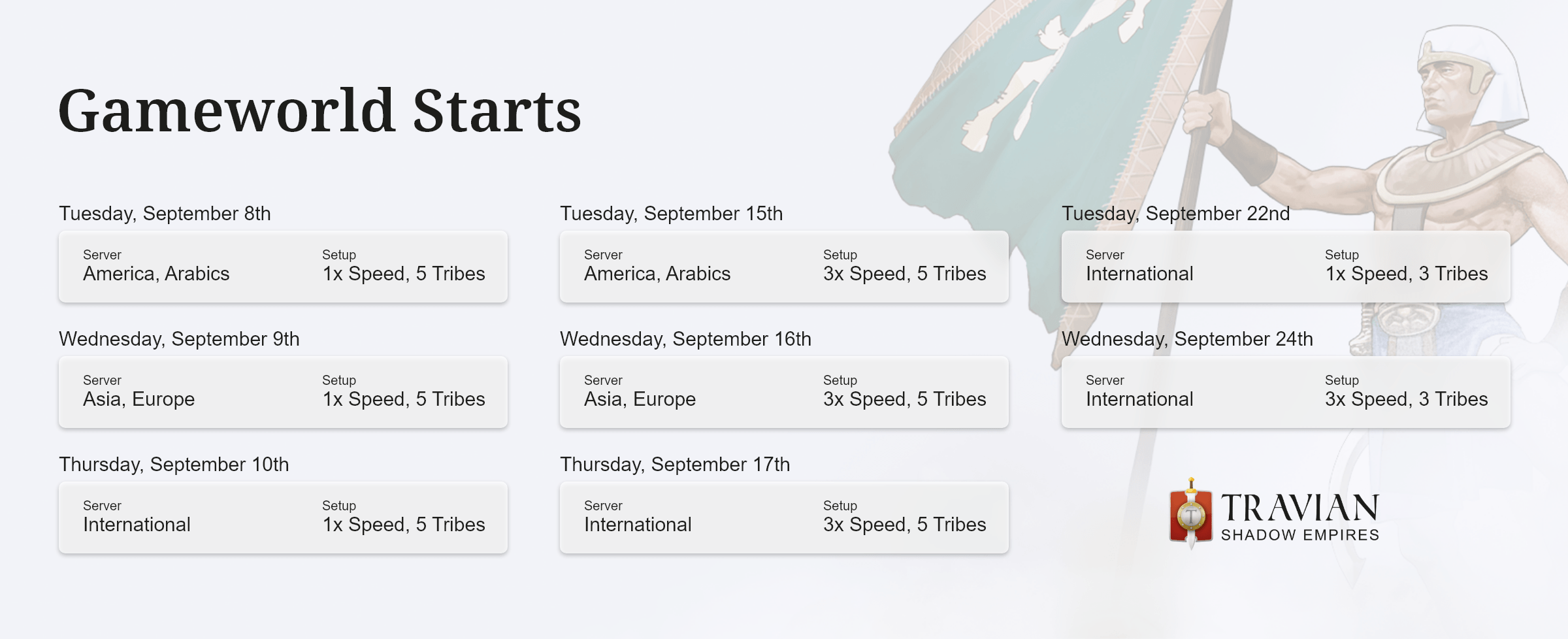 تراوین گیمز اخیرا زمان انتشار بازی Travian: Shadow Empires را اعلام کرد. بر این اساس، سرورهای آمریکا در تاریخ ۱۸ شهریور (مصادف با ۸ سپتامبر)، سرورهای آسیا و اروپا در تاریخ ۱۹ شهریور (مصادف با ۹ سپتامبر) و سرورهای بینالمللی هم در تاریخ ۲۰ شهریور (مصادف با ۱۰ سپتامبر) در دسترس قرار میگیرند. از ۸ سرور مختلفی که در نظر گرفته شده، ۶ مورد دارای پنج نوع قبیله (توتنها، رومیها، گولها، مصریها و هونها) هستند و دو مورد دیگر هم تنها از سه قبیله پشتیبانی میکنند. تفاوتها میان سرورها به همین یک مورد خلاصه نشده و سرعت گذر زمان هم در آنها فرق دارد. در ادامه میتوانید زمان لانچ هر سرور را به صورت جداگانه مشاهده کنید: