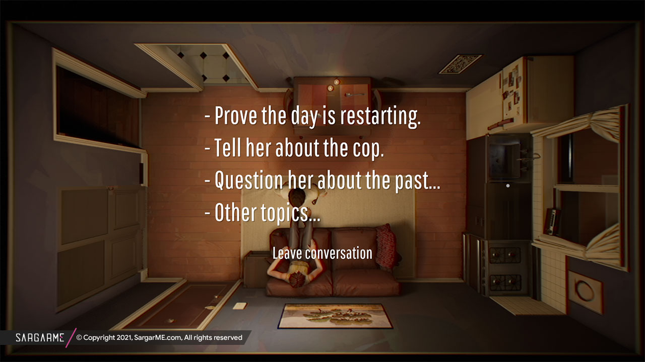 فرد مرموز با شکنجهی شخصیت اصلی، زن را وادار به لو دادن جای ساعت میکند اما قبل از شنیدنش مرد خفه شده و همه چیز به زمان ورود شخصیت اصلی به خانه باز میگردد. این چرخه آنقدر ادامه پیدا میکند تا بالاخره بازیکن راهی برای نجات خود و همسرش پیدا کند و در این راه ترتیب انجام کارها و انتخاب دیالوگها از اهمیت زیادی برخوردار است. زیرا همیشه دقیقا در میانهی چرخه شخص مرموزی که خود را مامور پلیس معرفی میکند از راه میرسد اما اولویت بندی شما در انتخاب، هر چرخه را از دیگری متفاوت میکند.