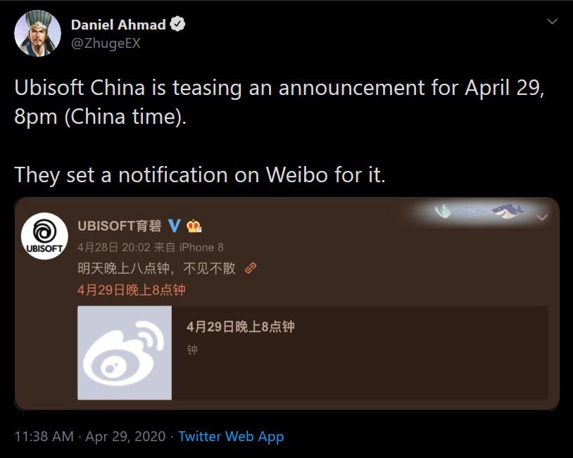 آقای Daniel Ahmad از اینسایدرهای معروف صنعت، ساعاتی پیش توییتی منتشر و اعلام کرد که یوبیسافت چین امروز قصد رونمایی از یک چیز جدید دارد. او با مشاهدهی پروفایل این استودیو در Weibo محبوبترین شبکهی اجتماعی از این قضیه مطلع شده است.
