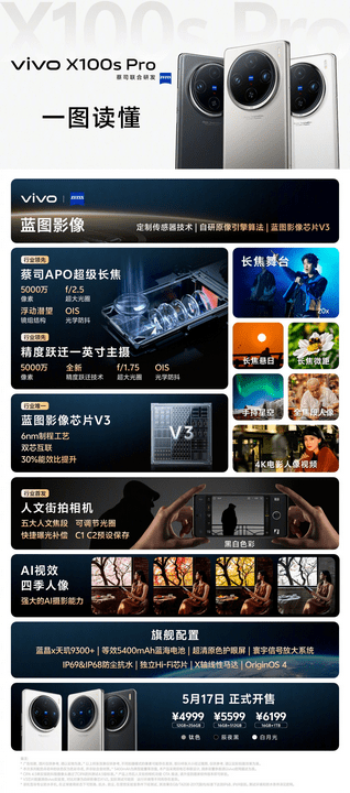 ویوو X100s و X100s پرو از تراشهی پردازش تصویر ویوو V3 هم بهره میبرد در حالی که برای مدل استاندارد از همان تراشه قدیمیتر V2 استفاده شده است. درست مثل مدلهای سال 2023، در این سری هم مدل پرو از یک سنسور دوربین قدرتمند با اندازهی 1/0.98 اینچ (1 اینچی) بهره میبرد که عملکرد فوقالعادهای در زمینهی عکاسی و فیلمبرداری دارد. همچنین دلیل اصلی بیرونزدگی دوربین از پنل پشتی هم به خاطر همین سنسور است.