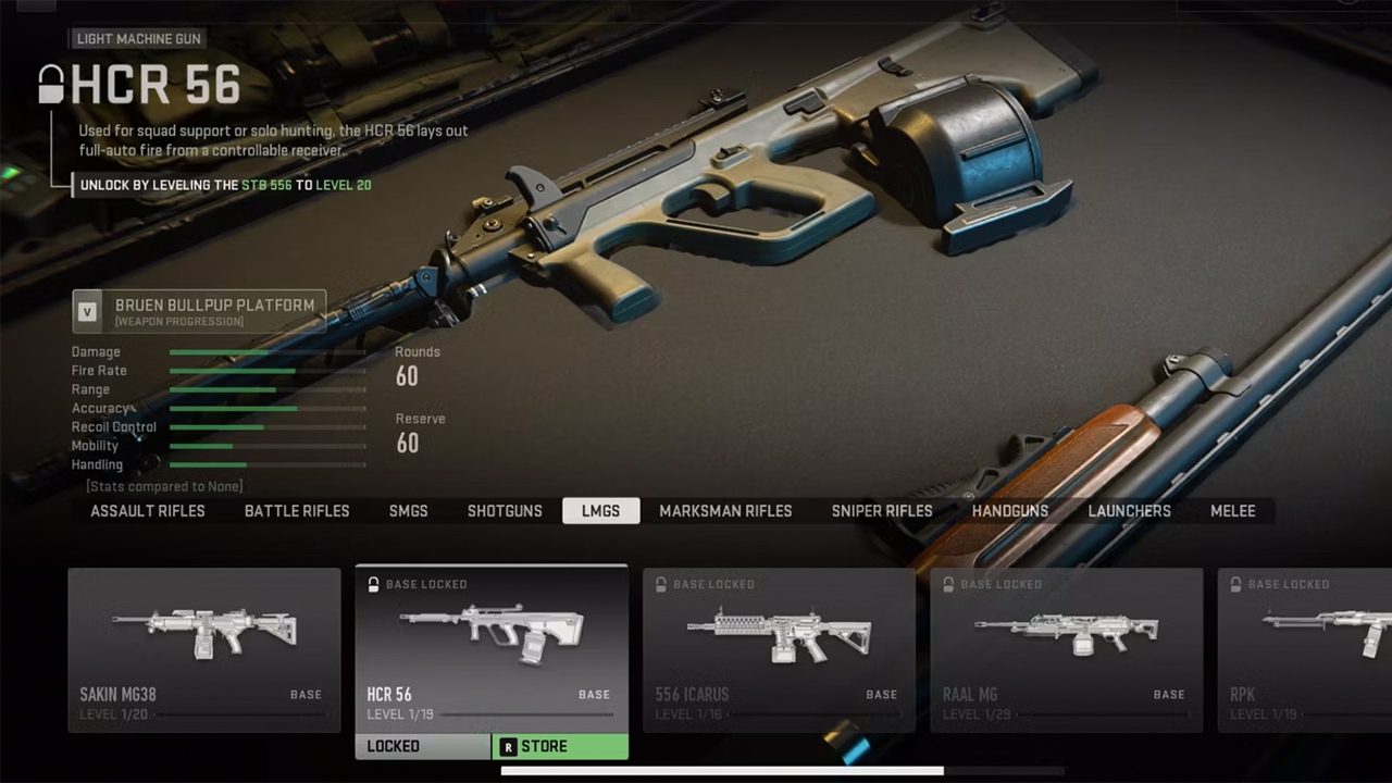 سلاح HCR 56 تنها سلاح LMG با ساختار دوست داشتنی بول پاپ (Bullpup) در وارزون موبایل است. ساختار بول پاپ به سلاح اجازه داشتن لولهای بلندتر در سلاحی با اندازه به مراتب کوچکتر میدهد. این موضوع سبب افزایش دقت گلولهها و در نتیجه کنترل بهتر سلاح میشود. علاوه بر آن، ساختار بول پاپ قدرت مانور سلاح را نیز افزایش داده که استفاده از آن را لذت بخش میکند. سلاح HCR 56 سلاحی بسیار مناسب برای مبارزات با برد متوسط بوده و حتی میتوان آن را سلاحی از دسته Assault Rifle با طول بیشتر دانست. مشکل این سلاح داشتن خشاب کوچک ۶۰ گلولهای است!