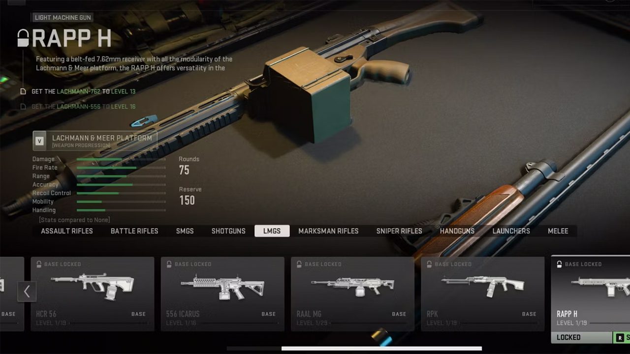 تفنگ RAPP H یکی از پر استفادهترین LMGها در وارزون موبایل است. سرعت شلیک قابل قبول و ضرب گلوله بسیار خوب، باعث شده کاربران زیادی از این سلاح به شکل مداوم استفاده کنند. مشکل بزرگ این سلاح اما لگد بسیار زیاد آن بوده که میتواند شما را اذیت کند. از سوی دیگر همچنین نباید فراموش کرد که وزن این تفنگ زیاد است و مناسب مبارزات نزدیک نیست. خشاب ۷۵ گلولهای این سلاح اما بسیار مناسب بوده و با سرعت شلیک و ضرب گلوله عالی، این تعداد گلوله را برای چنین سلاحی مناسب میکند. این سلاح شاید بهترین LMG وارزون موبایل نباشد، اما در مواقع زیادی قابل استفاده است!