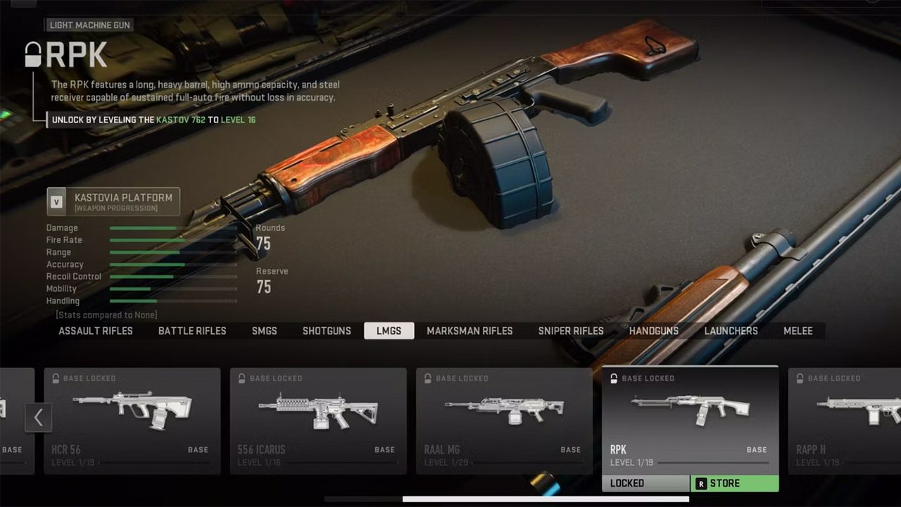 به باور عموم سلاح RPK بهترین LMG وارزون موبایل است. این سلاح شباهت بسیار زیادی با AK-47 داشته که تا بخش زیادی عملکرد خوب آن را توجیه میکند. ما در حقیقت با نسخه LMG سلاح محبوب AK-47 روبرو هستیم. همه چیز در این سلاح عالی است. بدنه سلاح وزن مناسبی داشته که مانور با آن را نسبت به دیگر سلاحهای هم کلاس ساده میکند. از سوی دیگر لوله آن لولهای بلند بوده که دقت و کنترل آن را افزایش میدهد. در ادامه شما خشابی ۷۵ گلولهای دریافت میکنید که امر از بین بردن گروههای بزرگ دشمنان را آسان میکند! این سلاح یکی از غولهای بزرگ وارزون موبایل است.