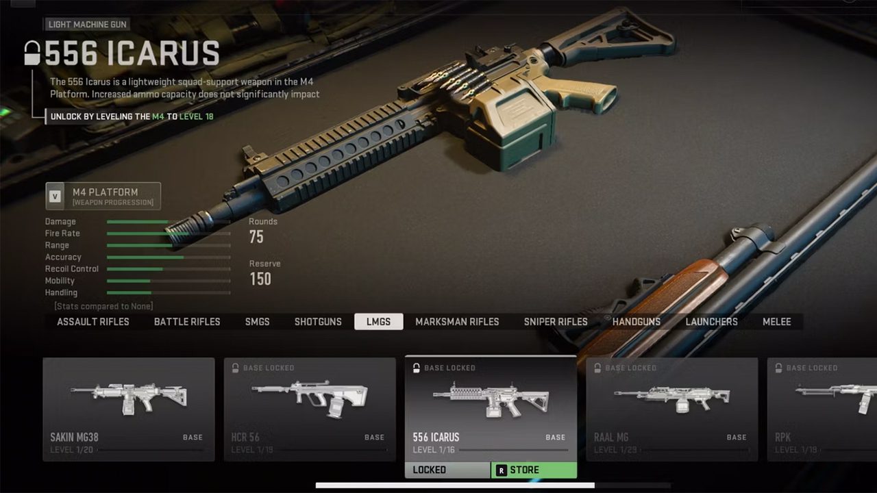 سلاح 556 Icarus سلاحی بسیار خاص بوده و قرار دادن آن در جایگاه درست کاری بسیار سخت است. این تفنگ در برابر دیگر تفنگهای این کلاس سرعت شلیک بسیار بیشتری دارد. این موضوع مثبت و منفی است. شما میتوانید از این تفنگ در قالب SMG استفاده کرده و همزمان با گذر از بخشهای مختلف آن را شلیک کنید. از سوی دیگر، سرعت بالایش باعث شده خشاب ۷۵ گلولهای آن به سرعت تخلیه شود. علاوه بر آن، برد، دقت و البته ضرب این سلاح نسبت به دیگر LMGها کمتر بوده و آن را تبدیل به تفنگی نزدیک برد میکند. همانطور که اشاره شد این سلاح بیش از LMG، سلاحی از کلاس SMG با وزن بیشتر و گلولههای بیشتر است!