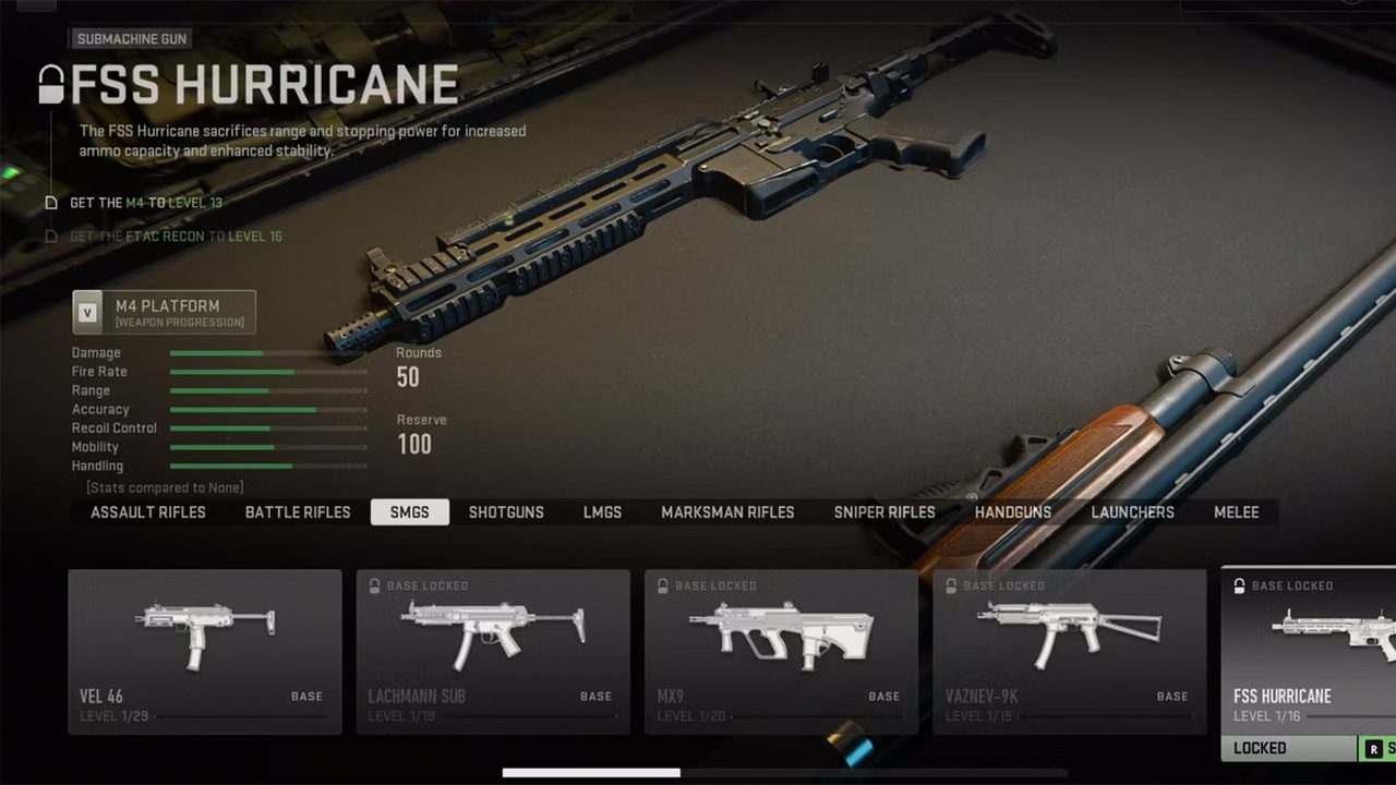 تفنگ جذاب FSS Hurricane بزرگترین خشاب در میان SMGهای بازی وارزون موبایل را ارائه میدهد. این تفنگ ۵۰ گلولهای یکی دیگر از بهترین SMG وارزون موبایل است. نکته منفی این سلاح ضرب گلوله بسیار پایین آن، حتی نسبت به دیگر تفنگهای هم کلاس است. نکات مثبت این سلاح، وزن فوق العاده کم و لگد قابل کنترل است. مبارزه در مبارزات نزدیک و پر تنش با این سلاح امری فوق العاده آسان است.