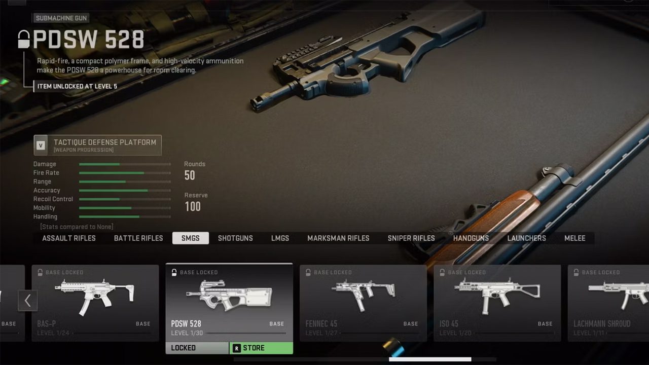 تفنگ PDSW 528 برگرفته از تفنگ دوست داشتنی FN P90 از معدود SMGها با سبک بول پاپ (Bullpup) بوده که با وجود وزن بسیار کم و قدرت مانور بالا، دقت بسیار زیادی دارد. این موضوع در کنار خشابی ۵۰ گلولهای آن را تفنگی خاص کرده است. این تفنگ همچنین سرعت شلیک زیادی داشته و آن را برای مبارزات در فاصله نزدیک و متوسط و حتی گاهی اوقات فاصلات دور مناسب میکند.