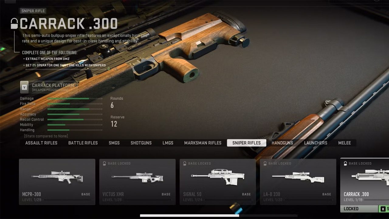 به تفنگ عجیب و جذاب Carrack 300 میرسیم. این تفنگ از مکانیسم بول پاپ (Bullpup) و قابلیت شلیک نیمه خودکار بهره میبرد. روی کاغذ ما با سلاحی بسیار کاربردی و قدرتمند آشنا میشویم. اما زمانی که این سلاح را وارد مبارزه میکنید، متوجه چندین مشکل میشوید. برد این سلاح نسبت به همتایان خود کم بوده و دقت گلوله آن بسیار کم است. اما نباید فراموش کرد مکانیسم بول پاپ سبب کاهش وزن آن شده و قابلیت شلیک نیمه خودکار آن را بیش از تک تیرانداز، تبدیل به سلاحی از کلاس Battle Rifle کرده است.