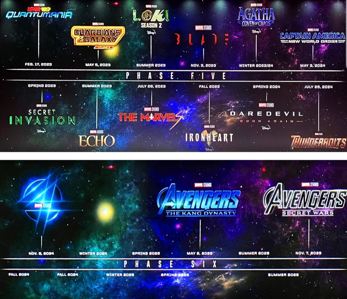 پیرو لو رفتن مجموعه تصاویری از پروندههای دفتر مالکیت معنوی اتحادیه اروپا توسط یک لیکر که به ثبت اسامی تجاری هیجان انگیزی توسط استودیو مارول اشاره داشت، کوین فایگی در کیمک کان سن دیگو ۲۰۲۲ از دو فیلم عظیم Avengers: Secret Wars و Avengers: The Kang Dynasty بهعنوان عناوین پایانی فاز ششم MCU رونمایی کرد.