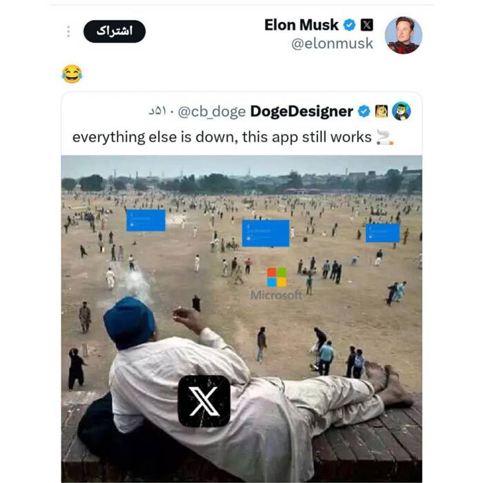 همهی اینها به کنار، در میان این اختلال جهانی ویندوز که همه را درگیر کرده، ایلان ماسک با انتشار یک تصویر در شبکه اجتماعی X (توییتر سابق) که اکنون زیر نظر او اداره میشود، با طعنه به این اختلال گفت: «در حالی که جهان در اختلال به سر میبرد، X همچنان بدون مشکل به کارش ادامه میدهد».