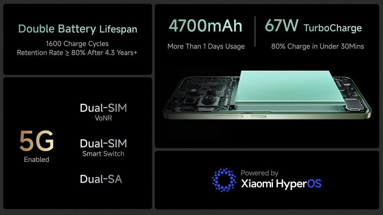 این گوشی از دو پردازنده بهره میبرد: اسنپدراگون 8s نسل ۳ و شیائومی T1. این پردازندهها همراه با حداکثر ۱۲ گیگابایت رم LPDDR5X و ۵۱۲ گیگابایت حافظه داخلی UFS 4.0 عملکرد فنی قدرتمندی را ارائه میدهند. البته تراشه T1 به بهبود عملکرد بلوتوث، وایفای، اینترنت همراه و GPS کمک میکند.