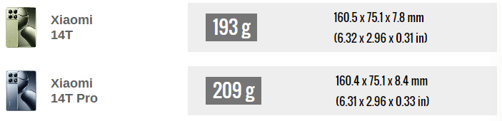 هر دو گوشی شیائومی ۱۴ تی و ۱۴ تی پرو از نظر ظاهری بسیار شبیه به هم هستند و ابعاد تقریبا یکسانی دارند. شیائومی 14T کمی نازکتر است و 193 گرم وزن دارد، در حالی که 14T پرو با وزن 209 گرم کمی سنگینتر است. این تفاوت به دلیل فریم آلومینیومی 14T پرو است، در حالی که 14T از فریم پلاستیکی استفاده میکند.