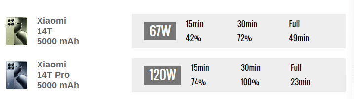 - سرعت شارژ بسیار سریعتر: شارژ 120 واتی مدل Pro امکان شارژ کامل گوشی در زمان بسیار کوتاهی را فراهم میکند، در حالی که مدل 14T با شارژ 67 واتی همچنان زمان بیشتری نیاز دارد.