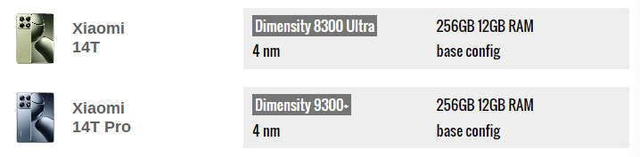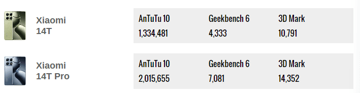 در تست AnTuTu، 14T پرو حدود 60% بهتر عمل میکند و در تست Geekbench حدود 77% عملکرد بهتری در کارهای چند هستهای دارد. همچنین در تستهای گرافیکی نیز 14T پرو با 33% عملکرد بهتری دارد.