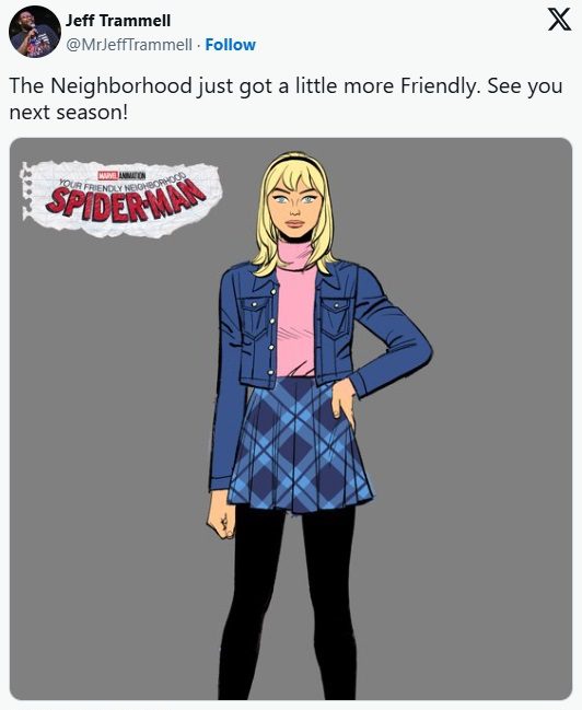 جف ترامل (Jeff Trammell) شورانر سریال مورد بحث در حساب کاربری خود در شبکه اجتماعی ایکس یا همان توییتر سابق حضور شخصیت گوئن استیسی در Your Friendly Neighborhood Spider-Man و دنیای سینمایی مارول را تایید کرد. ترامل عکسی نیز از ظاهر و طراحی این شخصیت نیز به اشتراک گذاشت که شامل پیشانیبند مشکی معروف این کاراکتر میشود. “محله کمی دوستانهتر شد. شما را در فصل بعدی خواهیم دید.”
