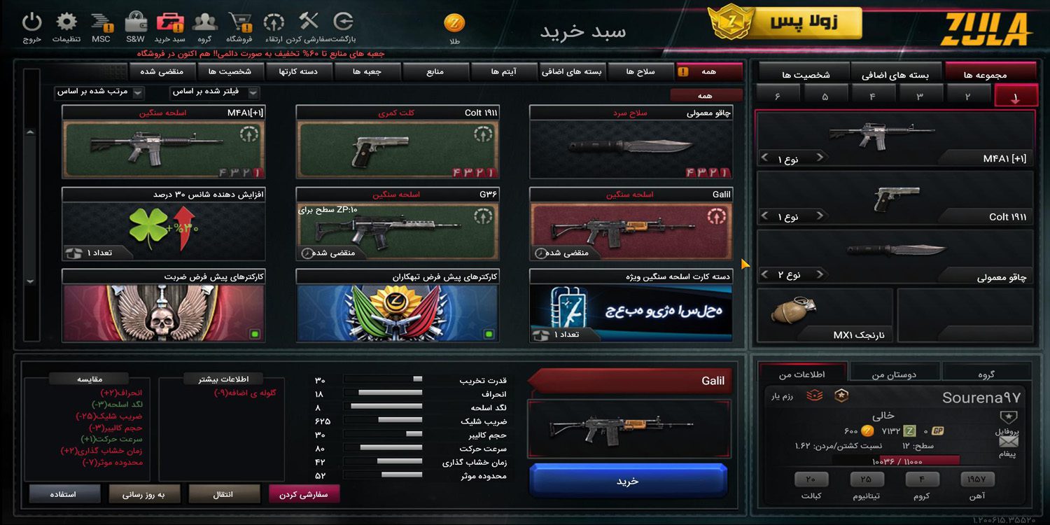 با زدن روی گزینهی «سلاحها» تمامی تجهیزات نظامی قابلخرید اعم از سلاح سبک، سلاح سنگین، اسنایپر، شاتگان، سلاح سرد و نارنجک به همراه نامشان برای شما نشان داده میشوند. همچنین هزینهای که باید برای دسترسی به آن سلاح پرداخت کنید هم به نمایش درمیآید. توجه داشته باشید برخی از تجهیزات با استفاده از زولا پوینت و برخی دیگر با زولا گلد قابلخریداری هستند. مسلما آن دسته از آیتمهایی که تنها با زولا گلد خریداری میشوند، قدرت و کارایی بیشتری نسبت به مدلهای مشابه دارند.