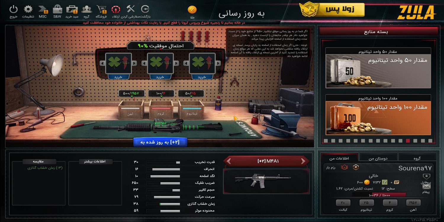 یکی از ویژگیهایی که باعث تمایز زولا از دیگر عناوین مشابه میشود، قابلیت ارتقاء سلاح است. در بازیهای اول شخص آنلاین، شخصی سازی تنها به ظاهر خلاصه میشود اما در اینجا میتوانید عملکرد را هم بهبود ببخشید. پس از ورود به بخش، در ابتدا باید سلاحی که میخواهید ارتقاء دهید را انتخاب کنید. ما M4A1 را انتخاب کردیم. پس از انتخاب سلاح، در پنجرهی میانی میزان منابع مورد نیاز برای بهبود عملکرد نشان داده میشود. همچنین در پنجرهی پایینی میتوانید ببینید افزایش سطح، عملکرد کدام یک از بخشهای سلاح را بهبود میبخشد. نهایتا باید روی گزینهی آبی رنگ کلیک کنید تا فرآیند ارتقاء آغاز شود. توجه داشته باشید فرآیندهای افزایش سطح همیشه با موفقیت به پایان نرسیده و برخی اوقات سرانجامی ندارند.