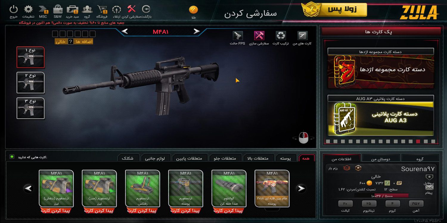 اگر پنجرهی میانی را با دقت نگاه کرده باشید، در گوشهی بالا سمت راست چهار گزینه میبینید که به ترتیب «کارتهای من»، «ترکیب کارت»، «سفارشی سازی» و «حالت FPS» نامگذاری شدهاند. با زدن روی گزینهی اول تمامی کارتهایی که در اختیار دارید و استفاده نشده به نمایش درمیآیند. گزینهی دوم این امکان را در اختیار شما قرار میدهد تا کارتهای مربوط به یک دسته را ترکیب کرده و روی سلاح خود به کار ببرید. به واسطهی این گزینه همچنین میتوانید با پرداخت طلا، یک کارت را ارتقاء دهید. گزینهی سفارشی کردن شما را به منوی ابتدایی میبرد. گزینهی چهارم و پایانی هم سلاح را به صورت اول شخص نشان میدهد.
