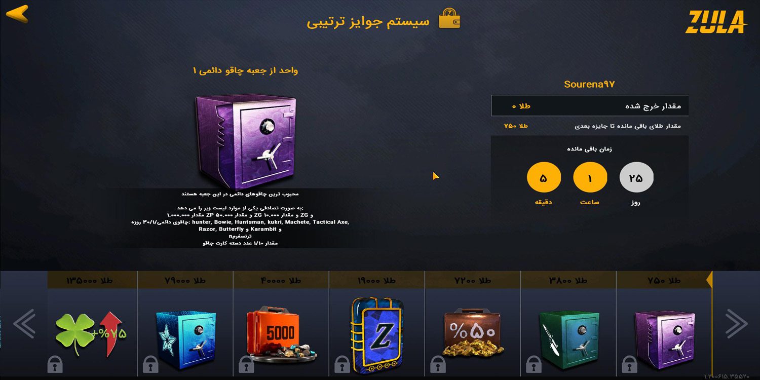 با کلیک روی گزینهی S&W به منوی «سیستم جوایز ترکیبی» ارجاع داده میشوید. اگر شما حد مشخصی از طلا را در فروشگاه بازی زولا برای خرید آیتمهای مختلف مصرف کنید، به شما یک جایزه داده میشود. برای مثال، پس از مصرف ۷۵۰ طلا، جعبهی XP به شما داده میشود که بعد از بازگشایی، یکی از آیتمهای داخل آن به صورت تصادفی به شما اهدا میشود. توجه داشته باشید این سیستم با گذشت یک مدت مشخص از نو شروع به کار میکند. در نتیجه، طلاهایی که در دور قبلی خرج کرده بودید دیگر حساب نخواهند شد. طلاهای مصرف شده در هر دوره و همچنین مدت باقی مانده از هر دوره در سمت راست صفحه نمایش داده میشود.