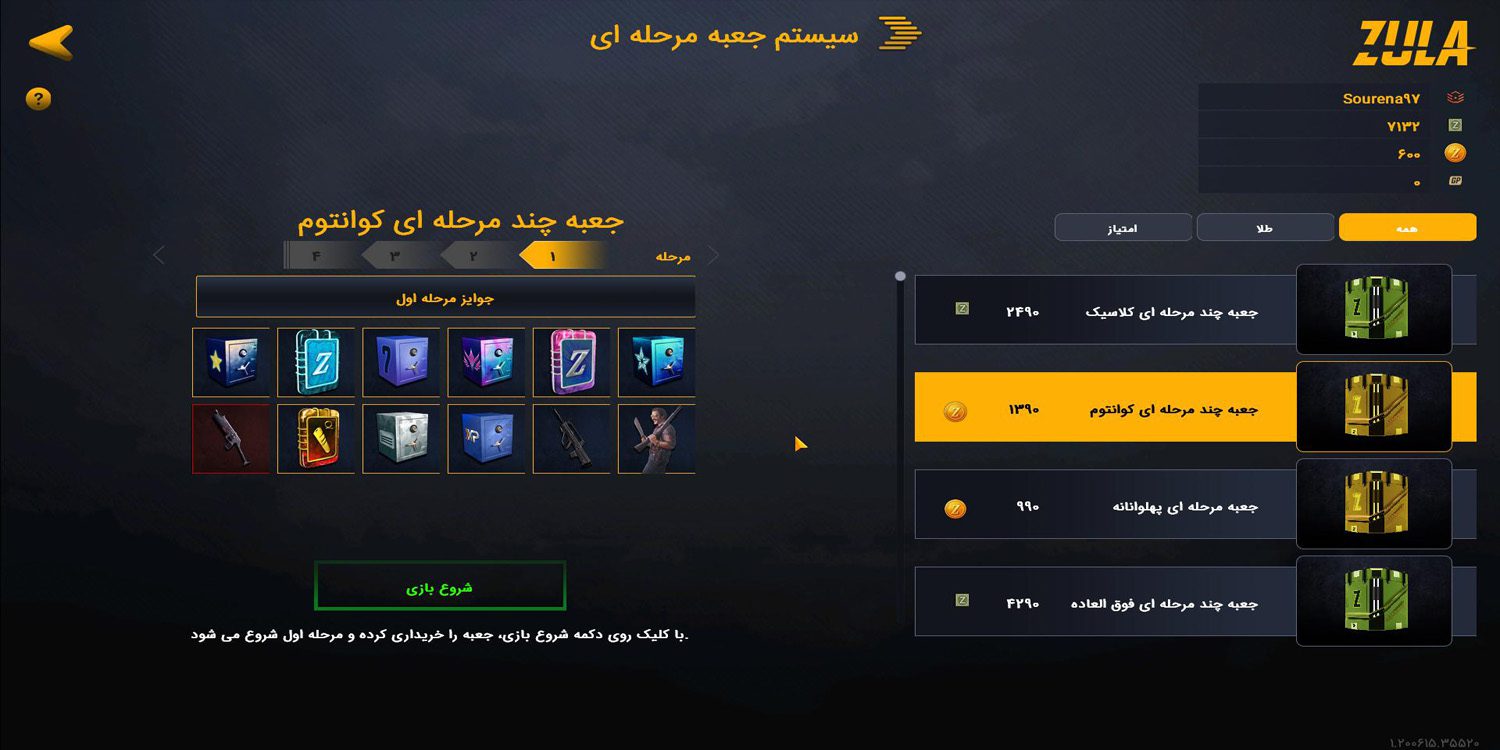 جعبهها به طور کلی به دو دسته تقسیم میشوند: جعبههایی که با طلا خریداری میشوند و جعبههایی که با زولا پوینت قابلتهیه هستند. جعبههایی که با طلا خریداری میشوند طبیعتا آیتمهای ارزشمندتر و مراحل بیشتری را در خود جای میدهند. برای مثال، وقتی شما جعبهی «چند مرحلهای کلاسیک» را میخرید، بازی در مرحلهی دوم به پایان میرسد اما با تهیهی جعبهی «چند مرحلهای کوانتوم» بازی تا چهار مرحله ادامه دارد. آیتمهای موجود در هر جعبه قابل مشاهده هستند. این موضوع به شما کمک میکند تا جعبهای را انتخاب کنید که آیتمهای مورد نیاز شما را شامل میشود. در ضمن، به واسطهی گزینههایی که در گوشهی بالا سمت راست قرار گرفتهاند، میتوانید مقدار زولا پوینت و طلایی که در اختیار دارید را مشاهده کنید.